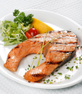 pandestegte rødspætter, frisk laks eller havørred