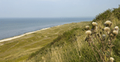 ses tydeligt oppe fra toppen af klitten. Stranden